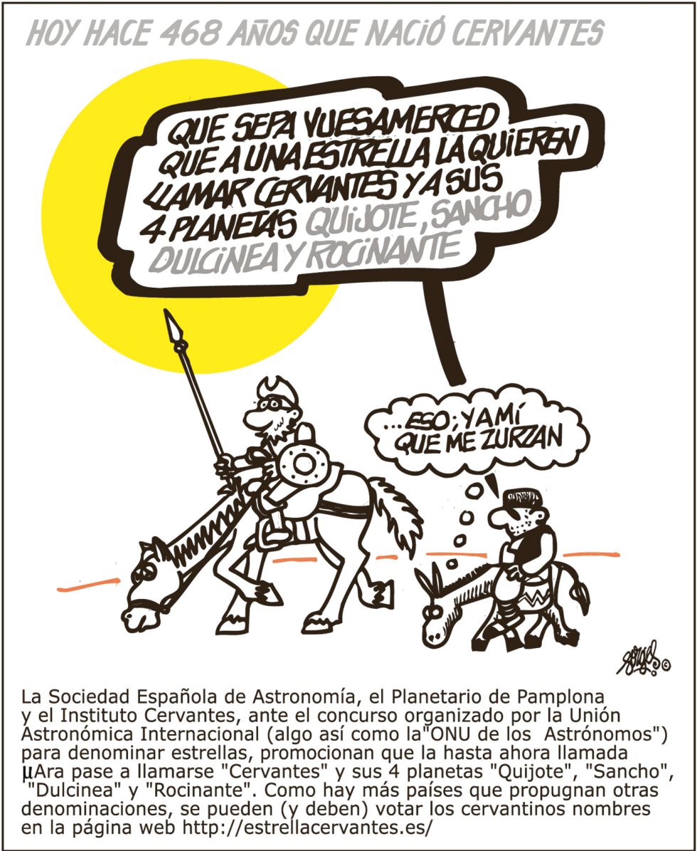 Es curioso que la primera entrada de Morning view tenga como protagonista a Cervantes. Es como si todo comenzase y terminase en él, como las salidas y regresos de su famoso personaje Don Quijote. También es llamativo que la viñeta que os voy a enseñar que trata sobre el aniversario del nacimiento de Cervantes -ayer se cumplían 468 años- y el artículo que os enlazo tengan tanta relación gracias a la extraordinaria y simbólica novela de nuestro escritor más representativo. Don Quijote se aventuraba a deshacer entuertos en busca de la conquista de su felicidad: ser un caballero andante; y conquistar a su vez el amor de la sin par Dulcinea del Toboso. Del mismo modo, el artículo La conquista de la felicidad nos traslada al país más feliz de la tierra según una encuesta de la reputada agencia Gallup. Paraguay, «la tierra sin mal» aparentemente  es el país ideal con una naturaleza exuberante, unos recursos inagotables, energías renovables casi eternas. Sin embargo, no existe una justicia igualitaria, la corrupción es igual de exuberante que la naturaleza y las distancias sociales son tan enormes como la gigante represa de Itaipú. Los guaraníes conquistan la felicidad a través de su filosofía de vida, de lo que llaman «koera» que significa si es que amanece. Para ellos solo importa el mañana, así que viven el presente en la ignorancia de un proyecto, en  la despreocupación total de su porvenir, en borrar las huellas de las tiranías que sufrieron. Actualmente, sólo alcanzan la infelicidad de una manera, que es bastante paradójica, el deseo frustrado de poseer las marcas de móviles, ropa, etc. que la globalización nos impone, es decir, por culpa del maldito materialismo. En fin, si Don Quijote cabalgase por aquellas tierras tendría muchos entuertos que deshacer.